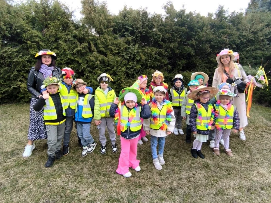 Dzień rozpoczęliśmy od wiosennego powitania piosenką „ Przyszła wiosna do lasu”. Następnie Pani Kasia zaprezentowała dzieciom gaik (zieloną gałązkę przystrojoną wstążkami, bibułą) i opowiedziała o starym zwyczaju chodzenia z gaikiem od domu do domu, co zwiastowało nadejście wiosny. Następnie Przedszkolaki przywitały Wiosnę prezentując się na czerwonym dywanie w Wiosennym Pokazie Mody. Dzieci, które wzięły w nim udział miały okazję zaprezentować przygotowane z pomocą Rodziców przepiękne nakrycia głowy. Wszystkich nas zaskoczyła niezwykła kreatywność zarówno dzieci jak i rodziców, wykorzystane do wykonania strojów ciekawe materiały, a także staranność oraz estetyka prac. Wielobarwne kreacje idealnie obrazowały Wiosnę, która do nas zawitała. Punktualnie o godzinie 11:00 , uśmiechnięci z piosenką na ustach wyruszyliśmy na spacer do pobliskiego lasu. Przedszkolaki okrzykiem „ Marzanno, Marzanno ty zimowa Panno, Ciebie pożegnamy, Wiosnę powitamy” ostatecznie pożegnały zimę. Po powrocie do przedszkola dzieci wykonały papierowe opaski w postaci motyla. Cieszymy się, że w taki sposób mogliśmy w pełni przywitać wiosnę, która obdarowała nas pięknym słoneczkiem. Mamy nadzieję, że dzięki zaangażowaniu naszych przedszkolaków wiosna zawita do nas na dobre, a wraz z nią ciepłe dni, z których będziemy czerpać radość.