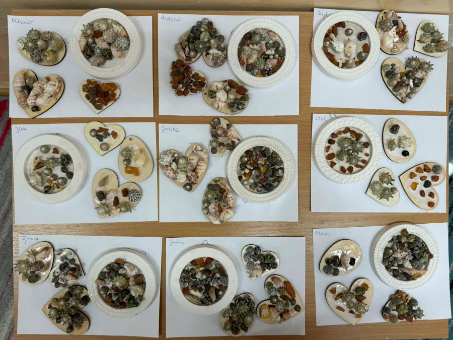 Podczas warsztatów uczniowie wysłuchali krótkiej prelekcji o bursztynie. Dowiedzieli się, jak powstaje ten niezwykły skarb Bałtyku oraz czym są inkluzje. Dzieci miały także okazję obejrzeć prawdziwe okazy bursztynu. Najwięcej radości sprawiła część praktyczna. Uczestnicy samodzielnie ozdabiali serduszka bursztynami i drobnymi muszelkami, tworzyli obrazki oraz zawieszki. Powstały piękne, oryginalne prace, które dzieci mogły zabrać ze sobą do domu jako wyjątkowe pamiątki. Warsztaty były nie tylko interesującą lekcją o bursztynie, ale również okazją do rozwijania kreatywności i dobrej zabawy.